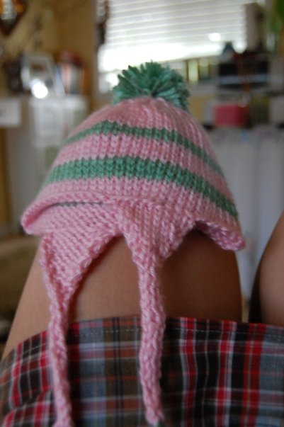 A funny little hat. I think I need to learn how to read a pattern, though, I really have no idea how. It might make hats a little less wonky, but after I added the earflaps and the ball on top it seemed to calm down a bit.
