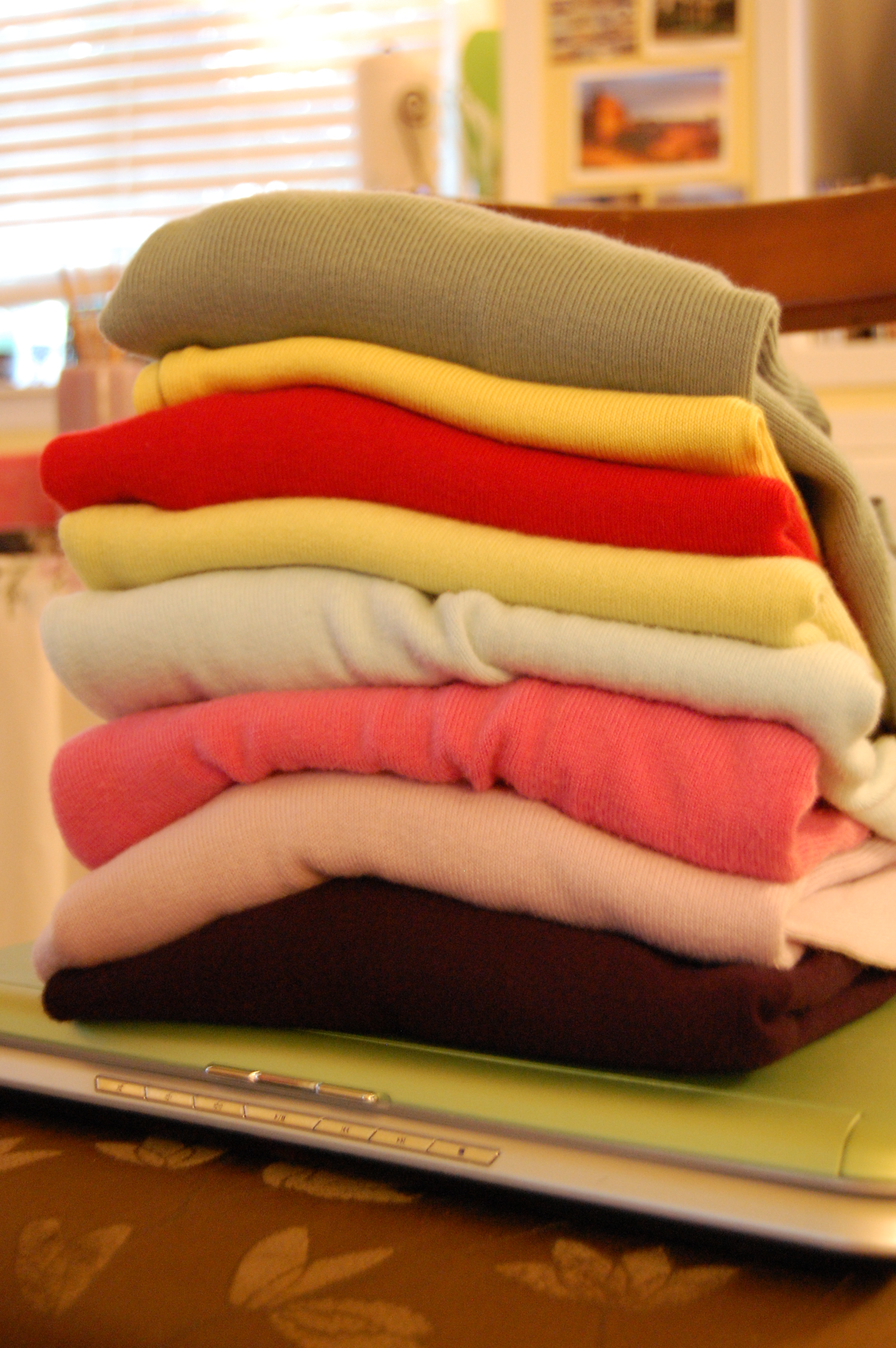 So I went to Bargain World and found an assortment of used sweaters, all of the cashmere type variety. (I say cashmere type because they’re not really nice sweaters, but just the comfy, soft fabrics) So I bought a bunch of old sweaters in lots of colors and they were all 50% off the already ridiculously low prices, so I bought lots of them.