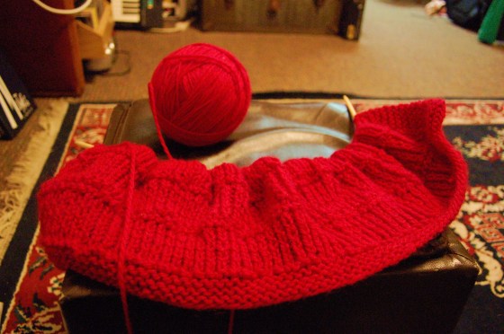 I obviously should have gotten longer needles for this project, but this was what I had on hand, so you make due, you know? I made Erika’s on this and it worked just fine, and although mine is about 2-3 sizes bigger it’s not too bad. But I got alot done over the weekend, despite it being pretty busy.