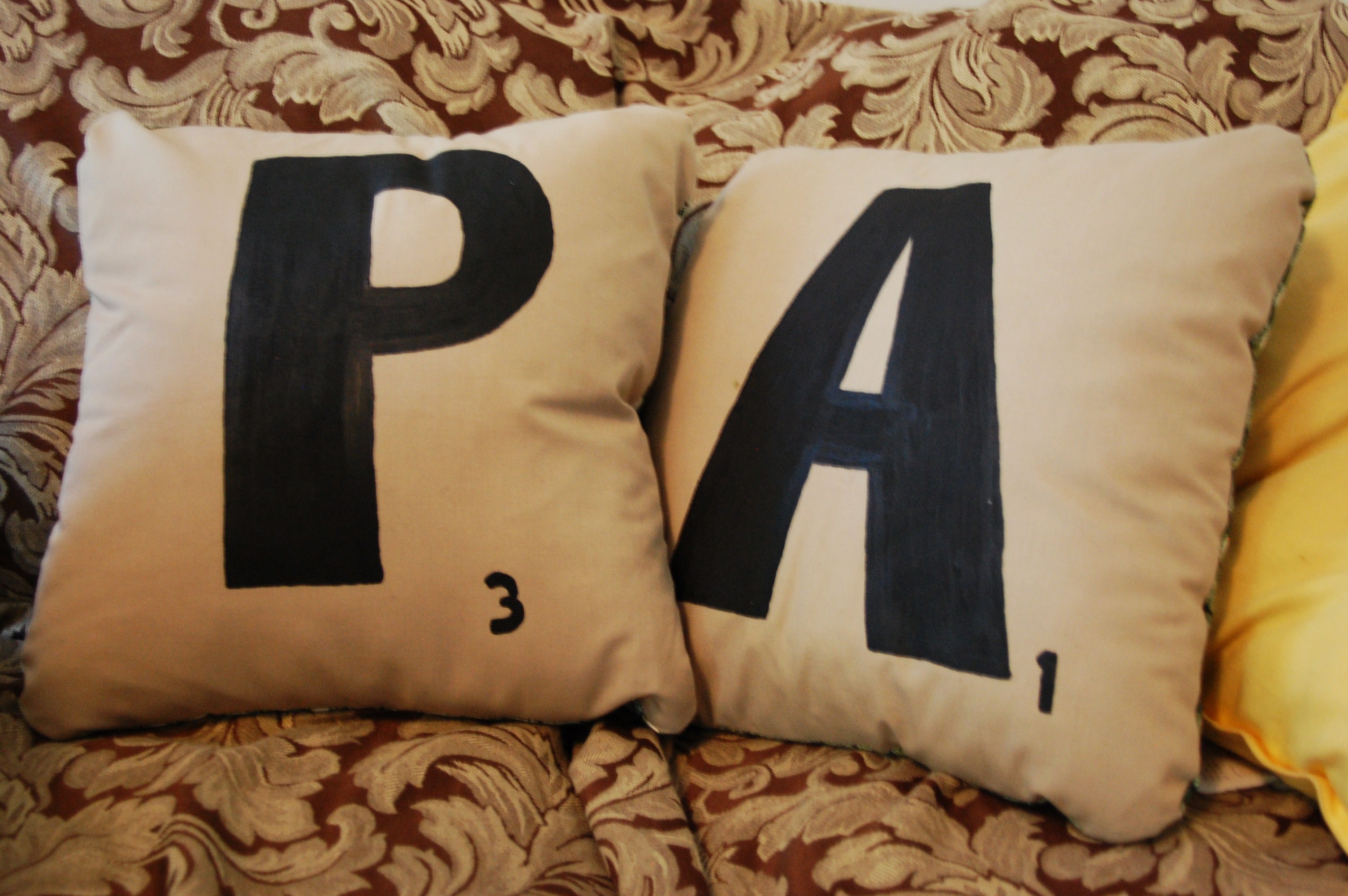 One of my very bestest friends, Autumn, soon to be wed, made these Scrabble Pillows for Paul and I! Aren’t they ADORABLE?! I LOVE them. They are so cute, sitting on our couch.