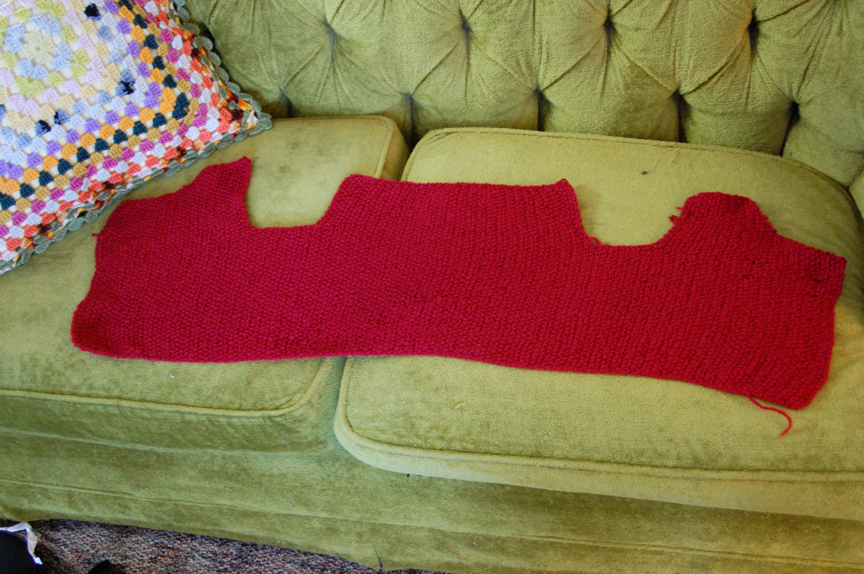 So I know it doesn’t look like much right now, but the whole body is done, and I am 1/2 way done with one arm, then the other arm and the hood are all that needs to be completed. Well, that and finding suitable buttons. That is always difficult for me.