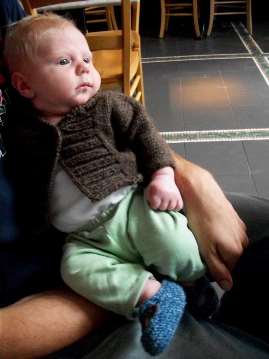 He’s wearing the jacket and the booties I made for him! Granted the sweater looks like it’s getting a bit tight, but hey, the booties still fit! And how cute is he, with his blonde surfer hair! I love this little guy!