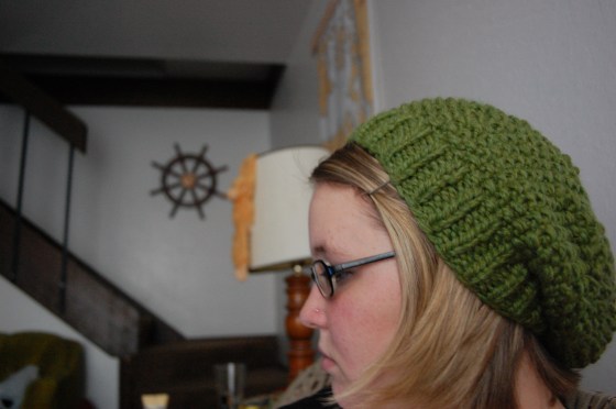 The pattern, though, is really cute and the hat looks adorable (I used the oatmeal colored yarn with flecks of brown in it). And is very cozy. But maybe the pattern was supposed to be cast on 48 stitches? I’ll have to try again but I’m out of Thick & Quick yarn and can’t afford to buy more. 😦