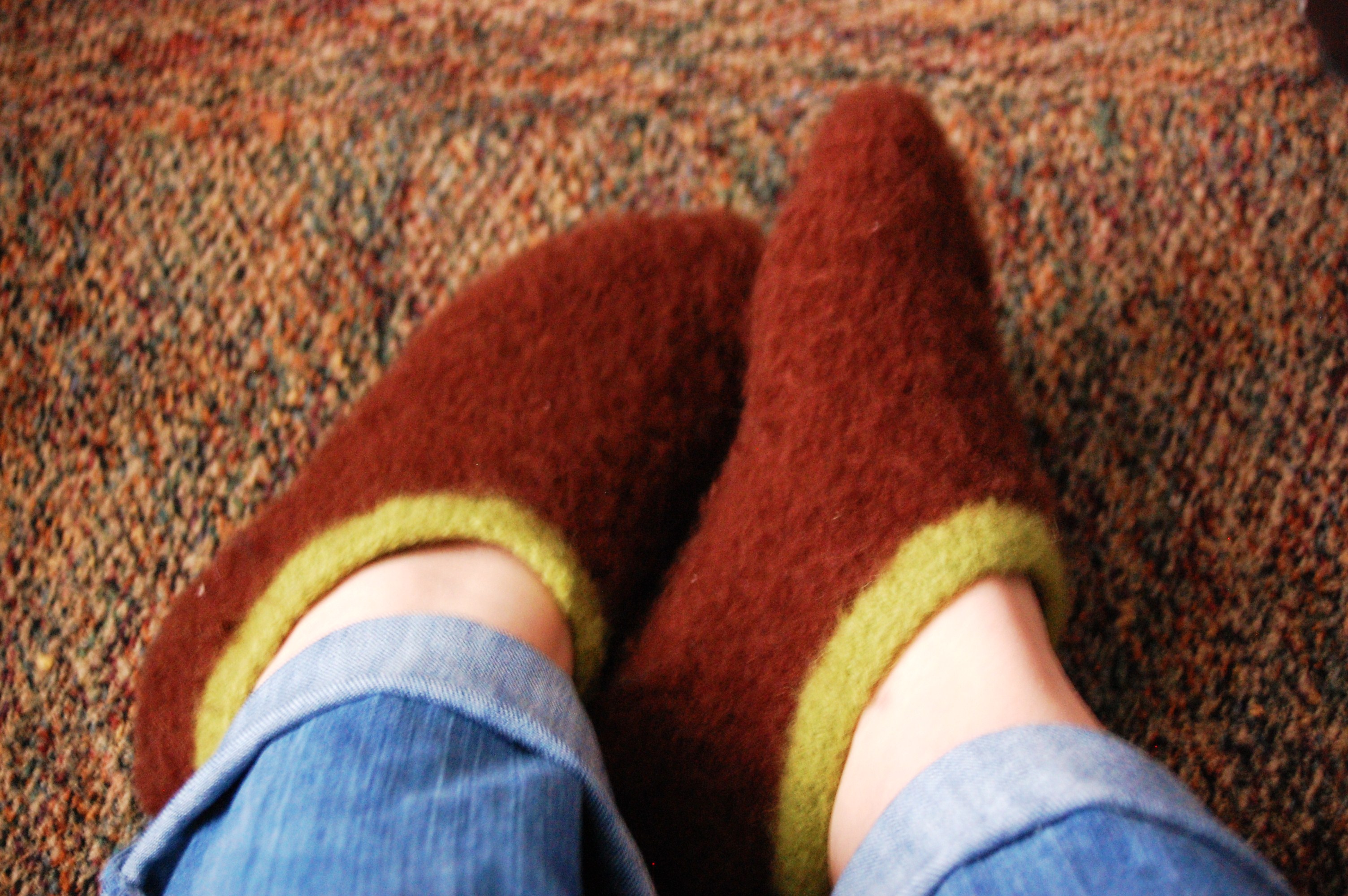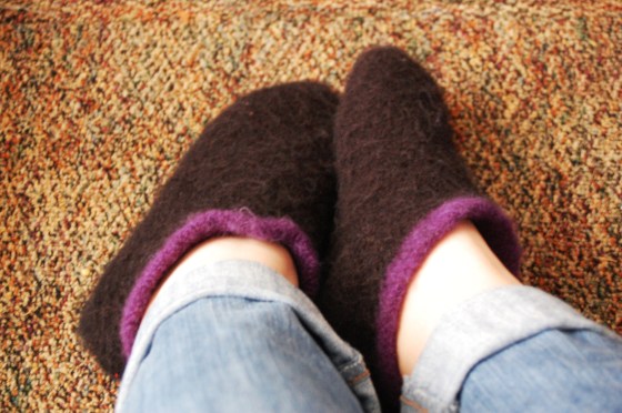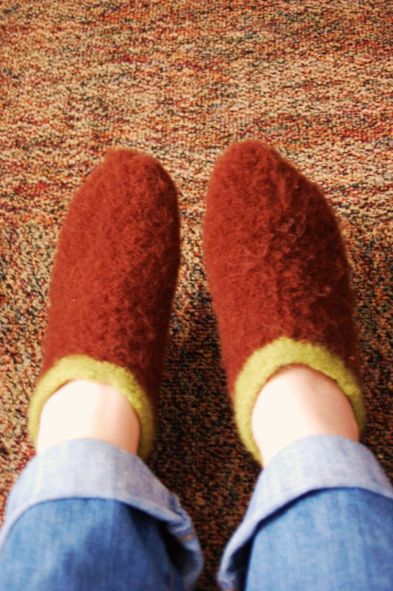 The trick is, right after felting you have to put them on your feet before they are completely dried to make them more foot-shaped. It worked really well this time.