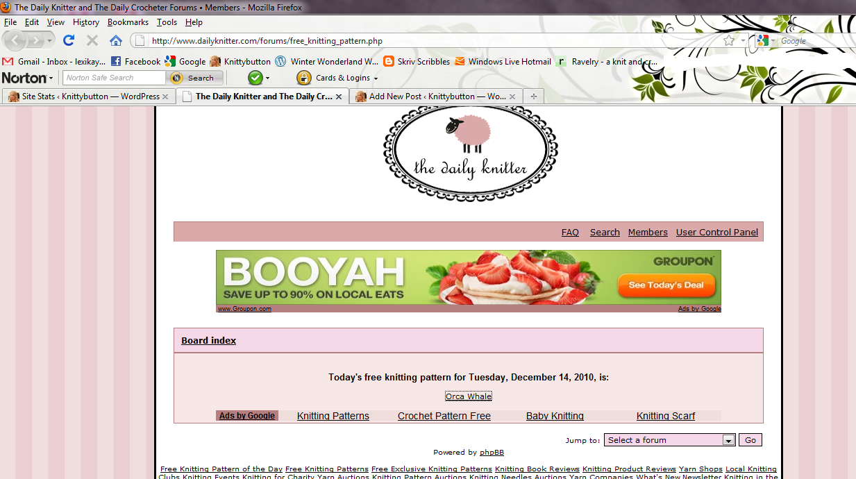 “Today’s free knitting pattern for Tuesday, December 14, 2010 is Orca Whale”, with a link to my blog and the orca whale pattern I posted a few weeks back!