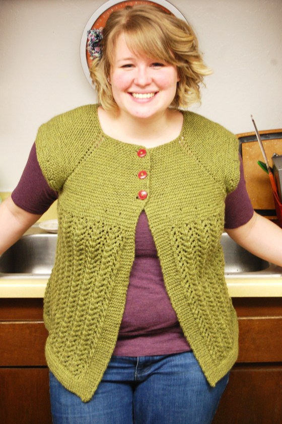 I am liking it without sleeves for now. I can always go back and add them on later if I feel like I want them. Also, I only have about 1/8th of a skein of yarn left, so that would mean ordering more yarn… so it’ll probably remain sleeveless.