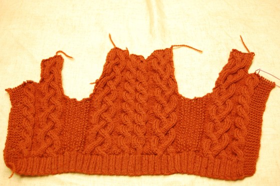 All I need to do now is make the hood and the sleeves and it’ll be completed! It’ll look better once it’s blocked, cables have a way of looking kind of wonky until they’re blocked.