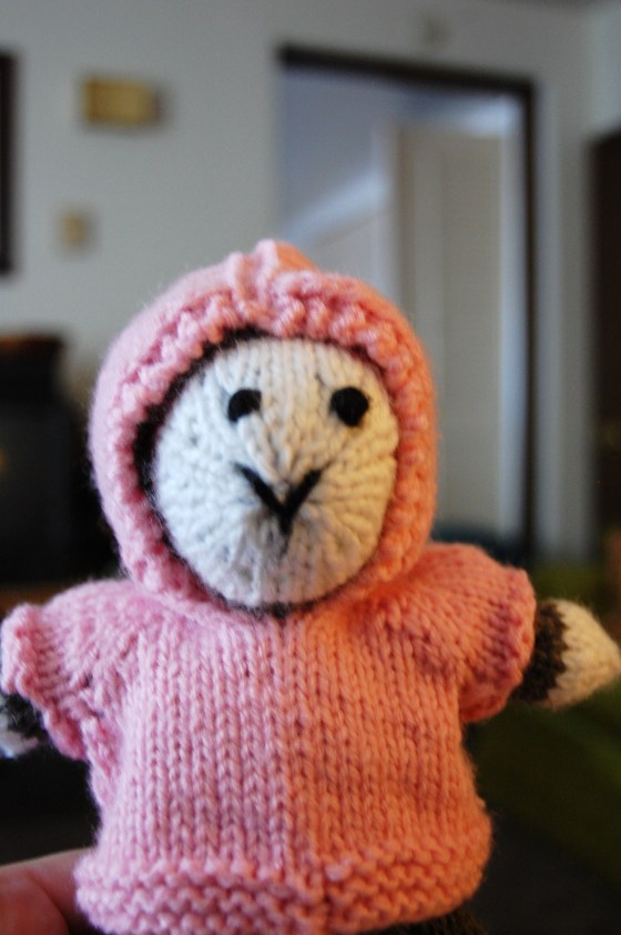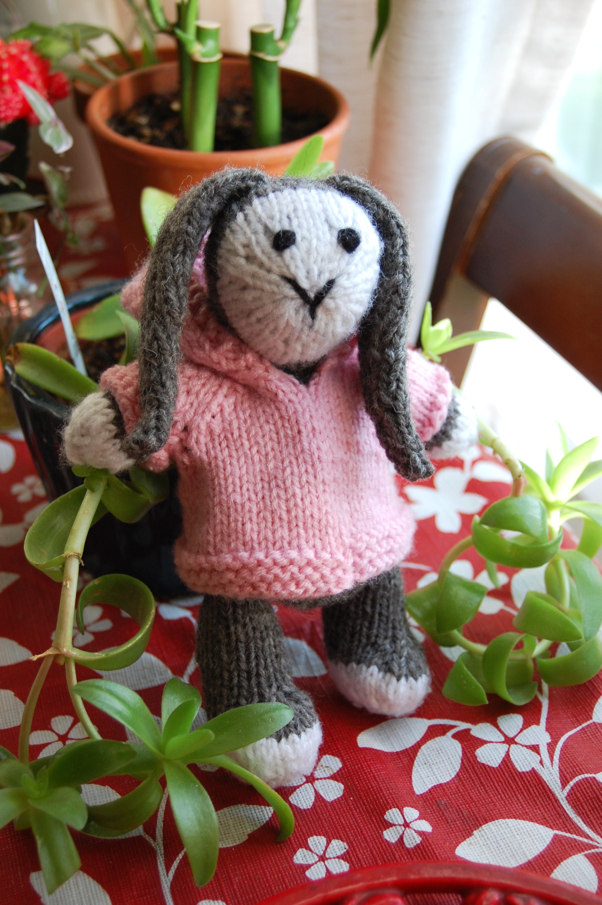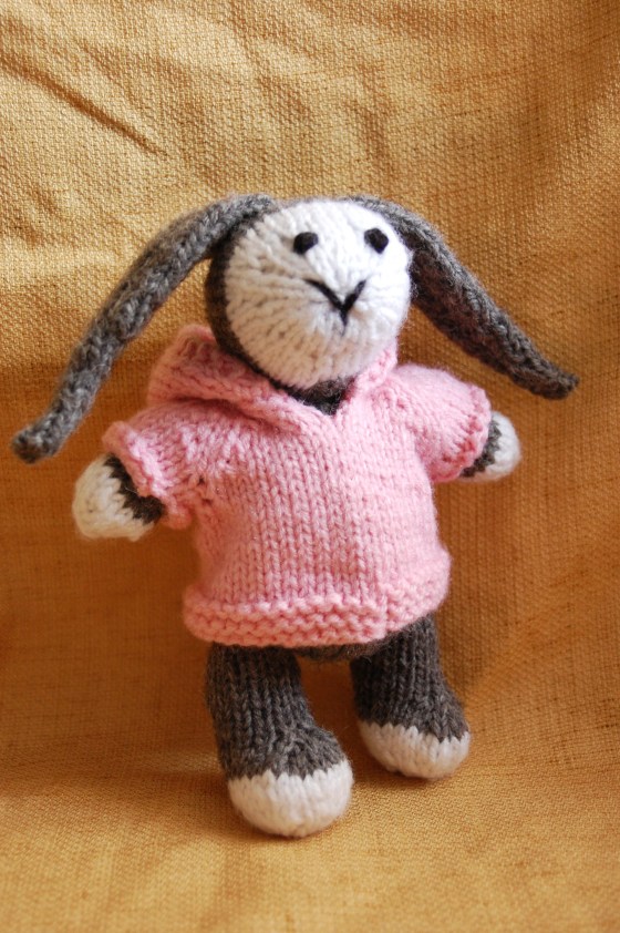 As far as the sweater goes that one was just completely made up as I went along, but it was a basic raglan top down sweater style.. I think I cast on 16 to start with? Then just picked up stitches around the neckline to make the hood. If you do make the sweater just make sure that the head-hole is big enough to get it onto the animal.