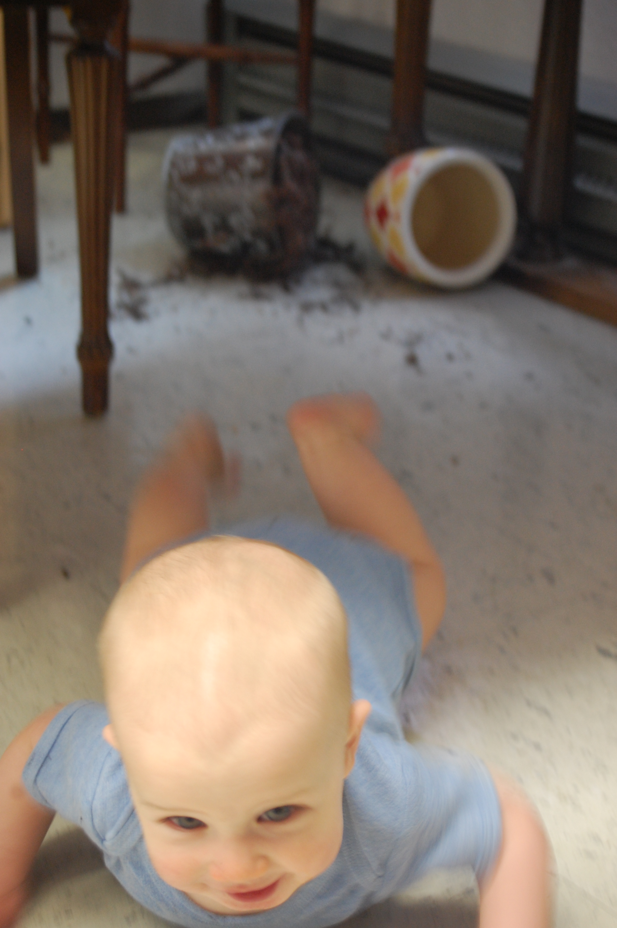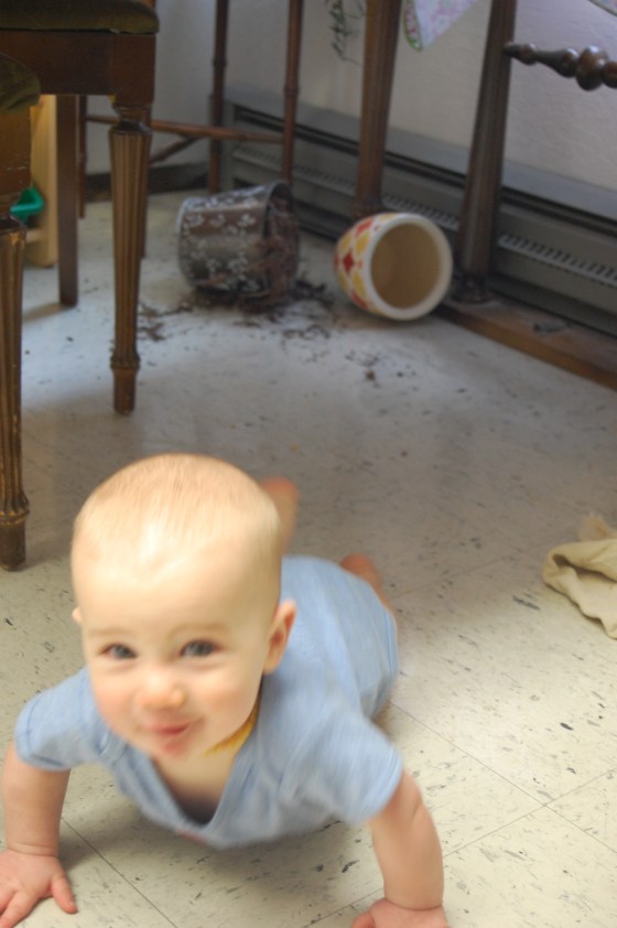 I left a potted plant on the floor in the kitchen and he managed to tip it over. As soon as I walked in the room he knew he was in trouble! He scurried away from the scene of the crime as fast as he could, but he was giggling the whole time. That smile is him pleading guilty.