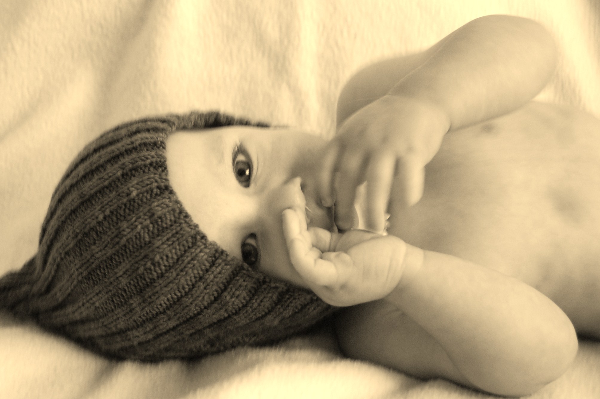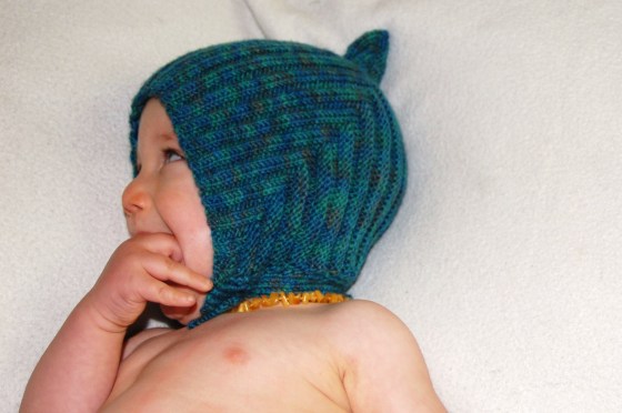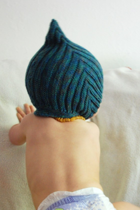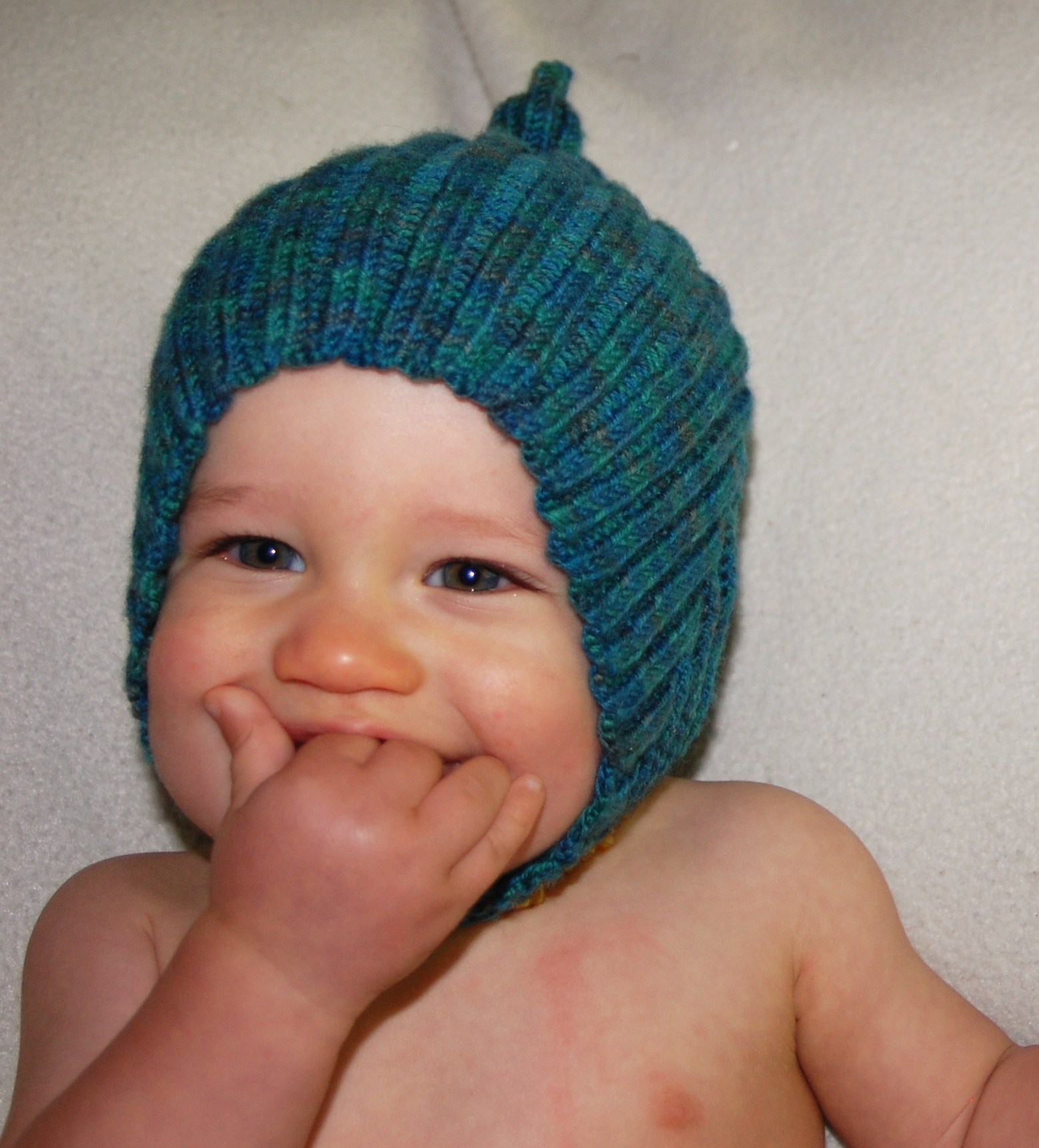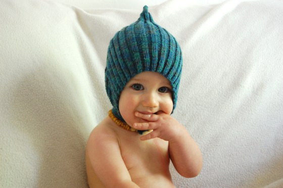 I made Sam a pixie hat (maybe we can come up with a more masculine name?) Followedthis pattern for Stella’s Pixie Hat, made with Plymouth Brand “Happy Feet” sock yarn. Made the smallest size, on size 3 needles, should fit him through this winter. I am in love with this yarn, it is sooo scrumptious. I love the subtle color flecks in the yarn and it’s so squishy and nice! And the way this pattern is knit is really fun. You knit it flat and then kitchener stitch the back together then add the button band!
