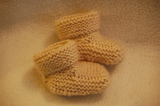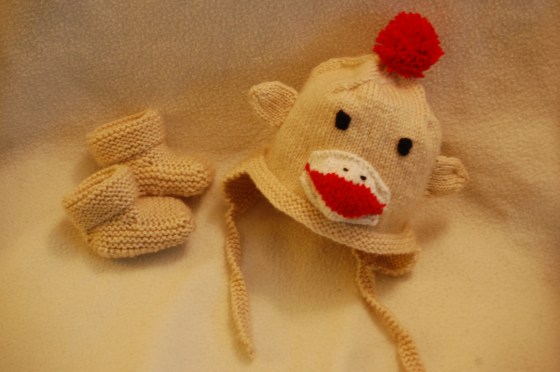 I like it when people request custom orders, because then I get to make things I wouldn’t necessarily think to make, you know, like a tan sock monkey hat! The booties turned out pretty cute, too!