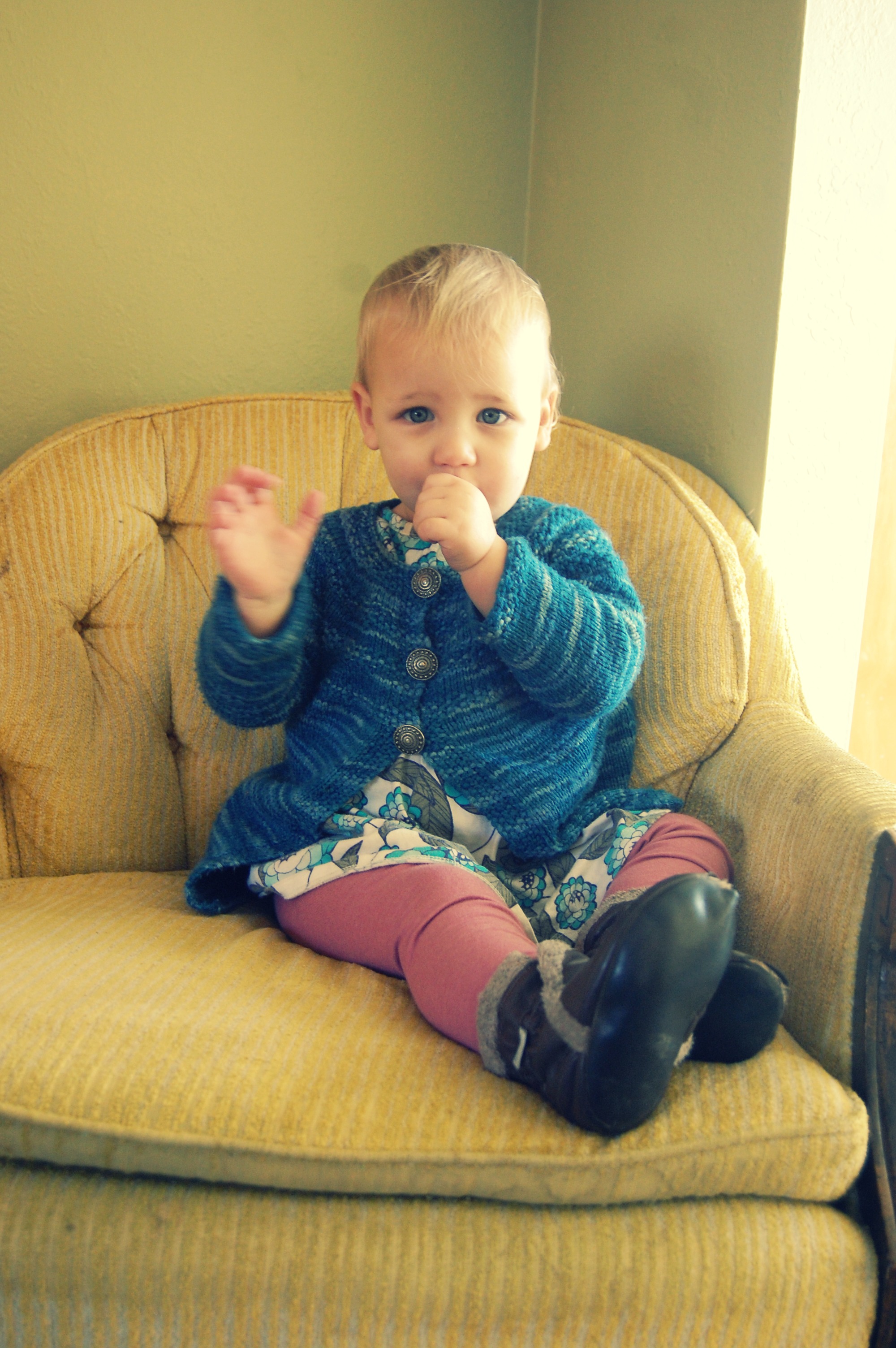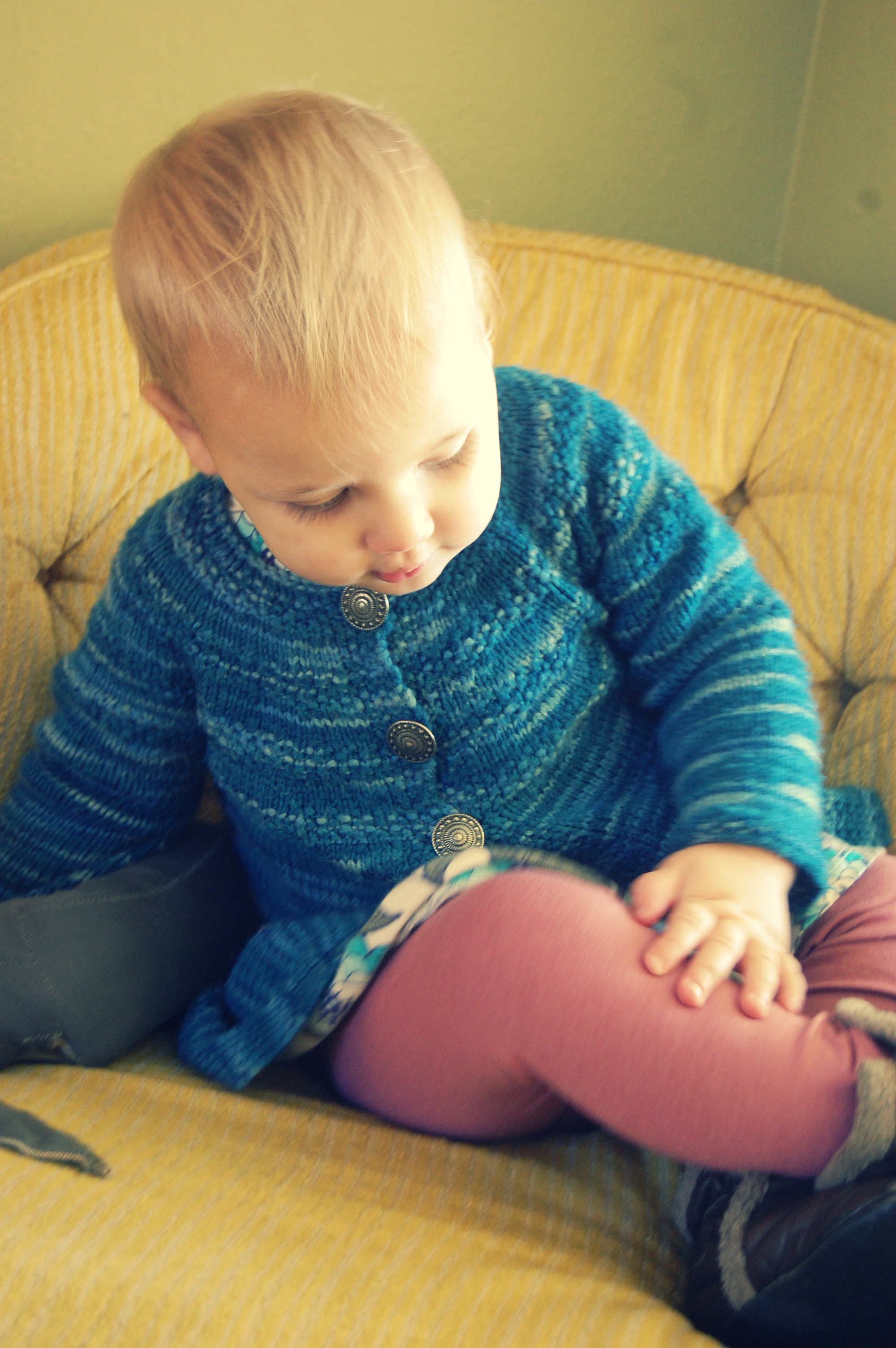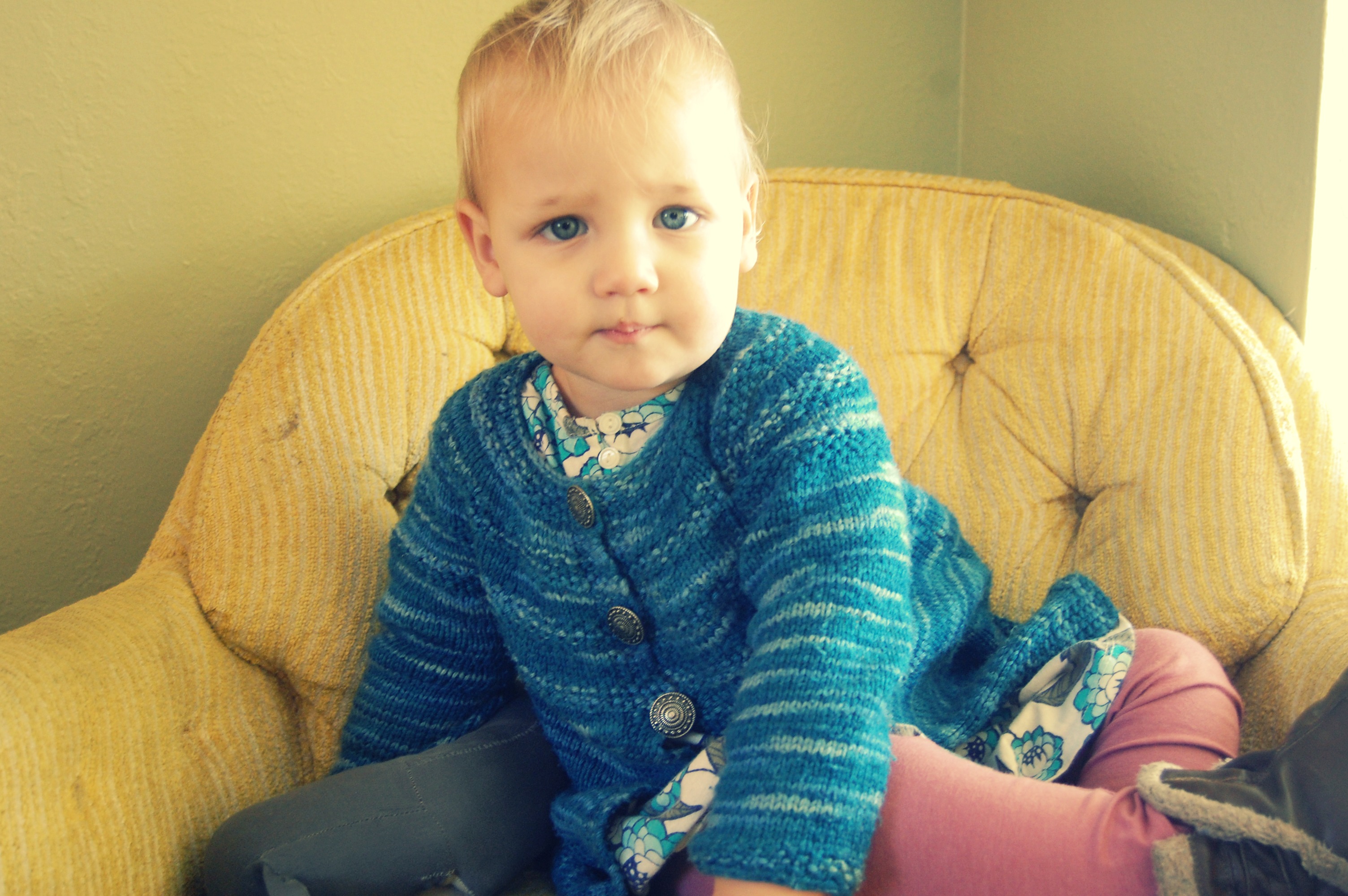 I made Effie this sweater from KnitPicks Swish Superwash Merino “Pacific Tonal” (Which I think has been discontinued?). The pattern is The Matinee Jacket, from “Vintage Knits for Modern Babies” (A super awesome book, which you should buy. It has a ton of adorable patterns!)