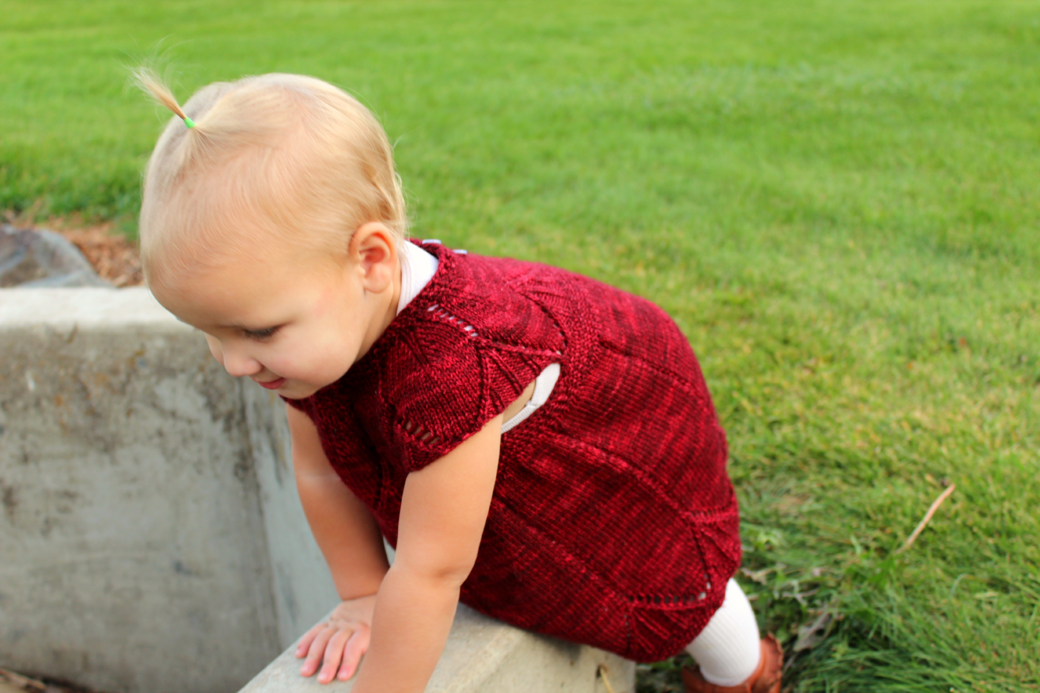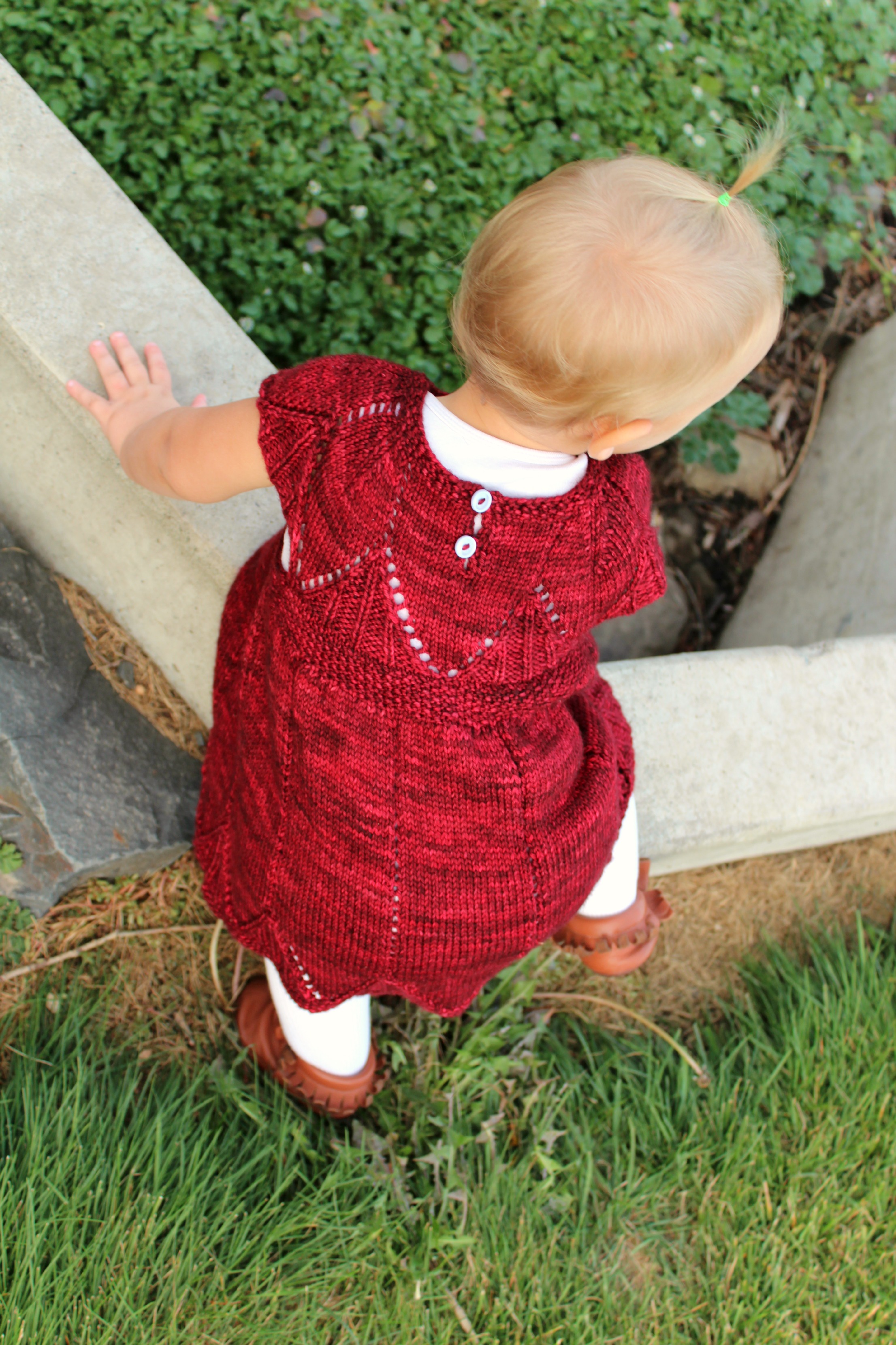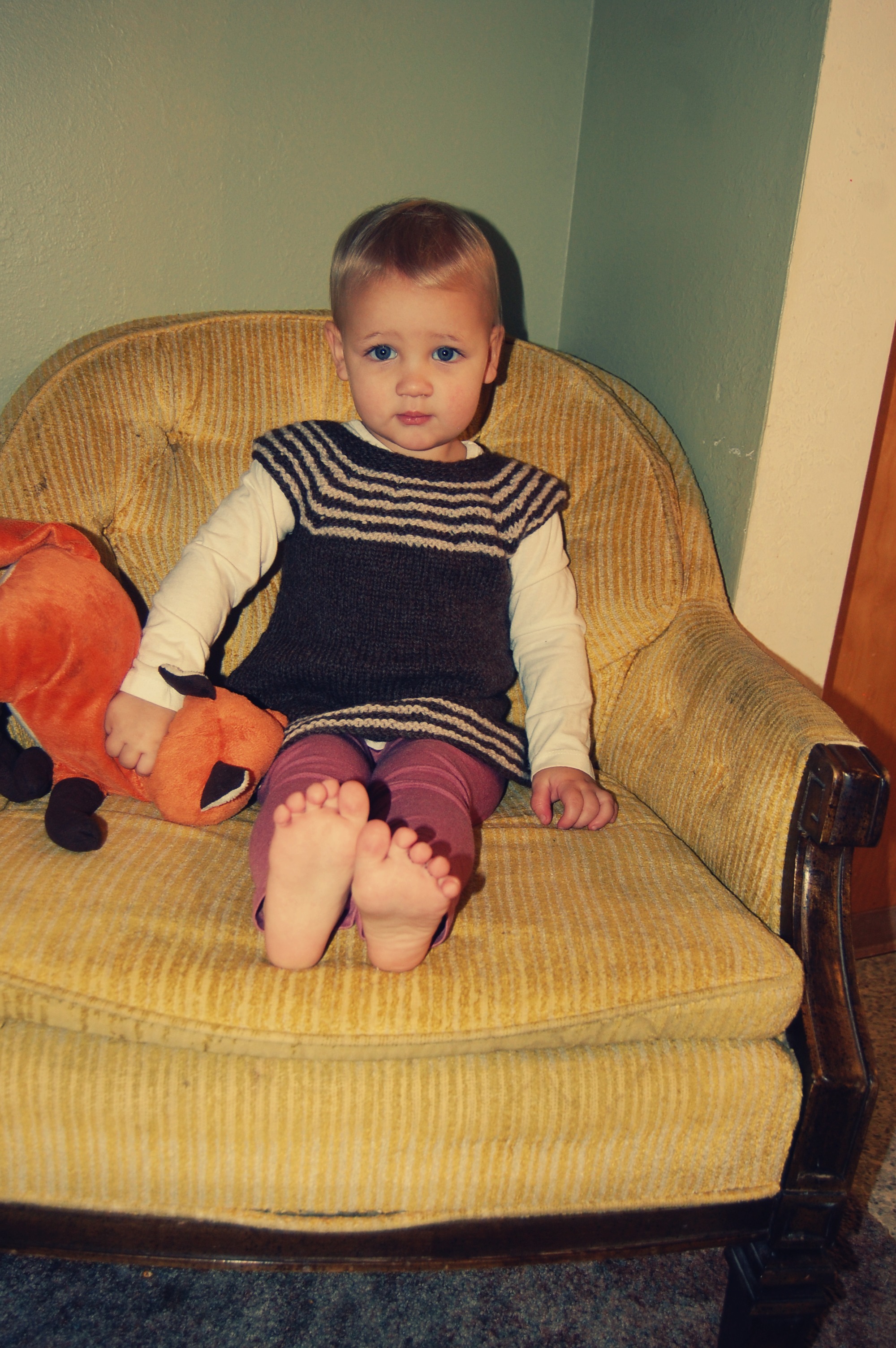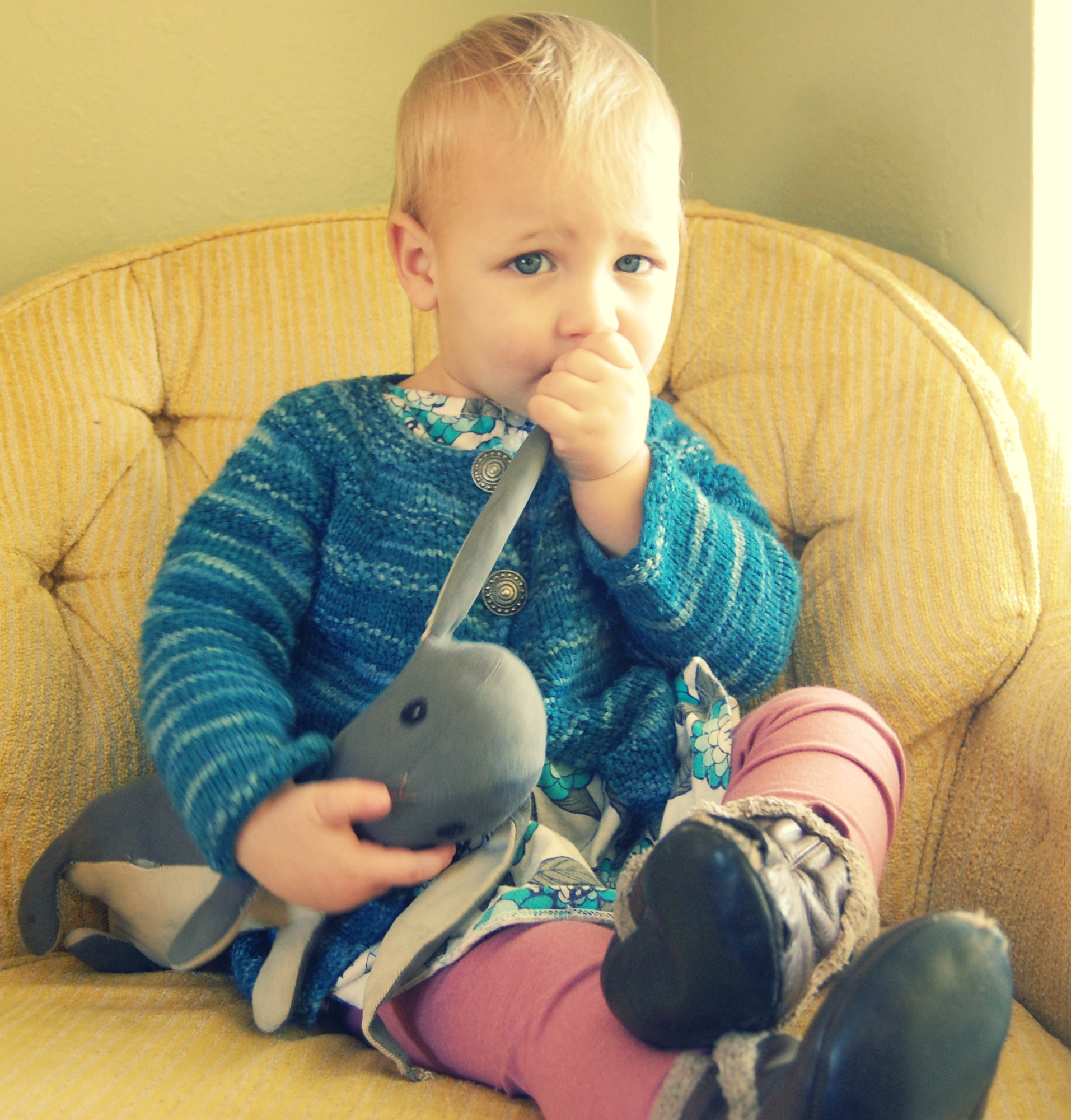 I made Effie this sweater from KnitPicks Swish Superwash Merino “Pacific Tonal” (Which I think has been discontinued?). The pattern is The Matinee Jacket, from “Vintage Knits for Modern Babies” (A super awesome book, which you should buy. It has a ton of adorable patterns!)